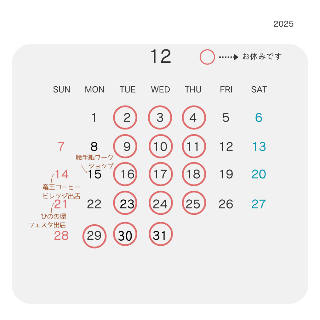 年末は12/28(日)まで、年始は1/4(日)から営業予定です。